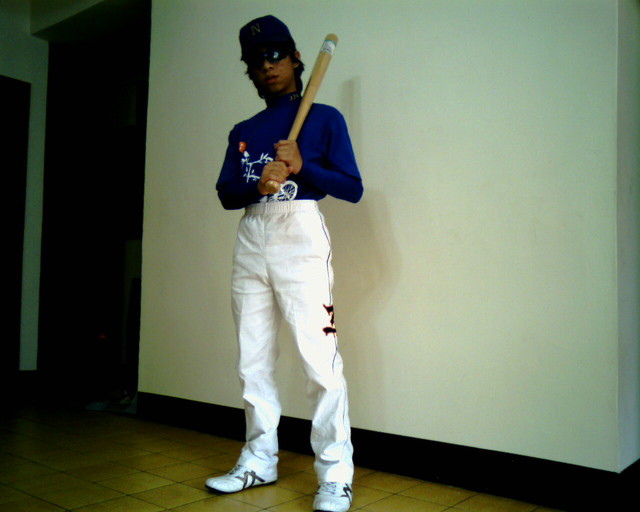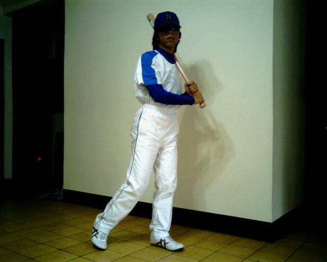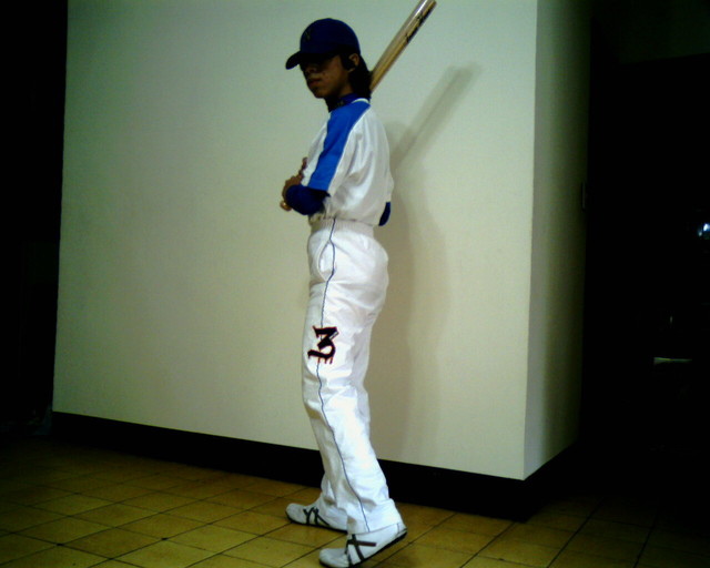 主場是今年二月登板的白色短袖上衣,褲子是新的寶藍線條的白褲,三張照片觀察看看,很像職棒球員或業餘棒球員穿的棒球服.