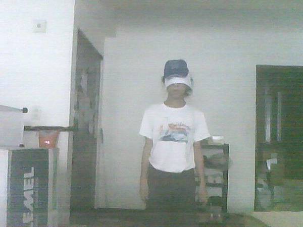 2012年網路藝人魚兒男子版本(Boy Ver.)猴子魚的服裝照,看到頭戴藍色的帽子,紙遮著臉,穿著白色的短袖上衣和棕色短褲。