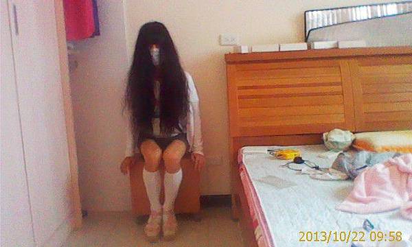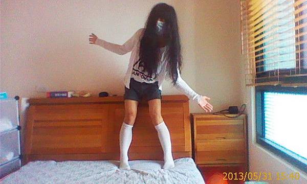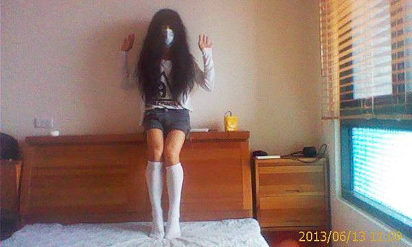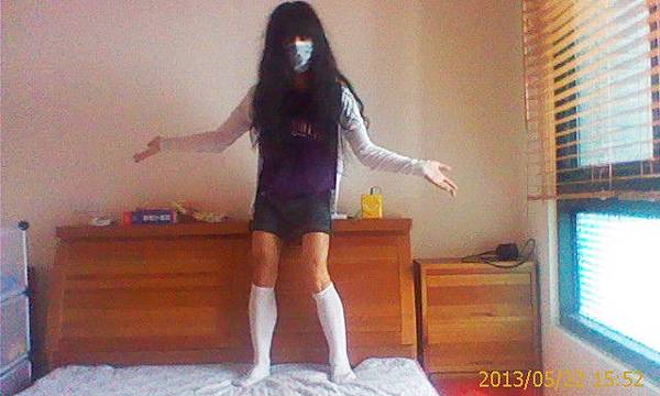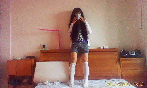 2013年五月二十二日網路藝人魚兒的女子版本(Girl Ver.)小魚拍攝改版演奏音樂舞蹈影片Bed Dance的服裝概念照,髮型是齊瀏海長髮,網路藝人魚兒的女子版本(Girl Ver.)小魚的演奏音樂舞蹈影片Bed Dance的服裝概念照可以看到網路藝人魚兒的女子版本(Girl Ver.)小魚穿的服裝是白色外套、紫色短袖上衣、牛仔短褲、白色長襪。