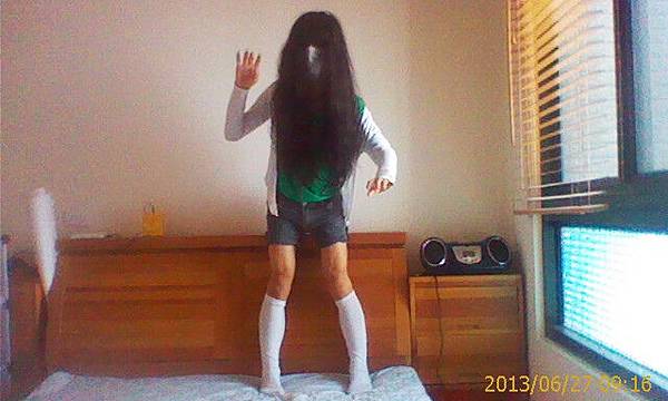 2013年六月二十八日網路藝人魚兒的女子版本(Girl Ver.)小魚拍攝演奏音樂舞蹈影片Crazy Pop的服裝概念照,髮型是齊瀏海長髮,網路藝人魚兒的女子版本(Girl Ver.)小魚的演奏音樂舞蹈影片Crazy Pop的服裝概念照可以看到網路藝人魚兒的女子版本(Girl Ver.)小魚穿的服裝是白色外套、綠色短袖上衣、牛仔短褲、白色長襪。